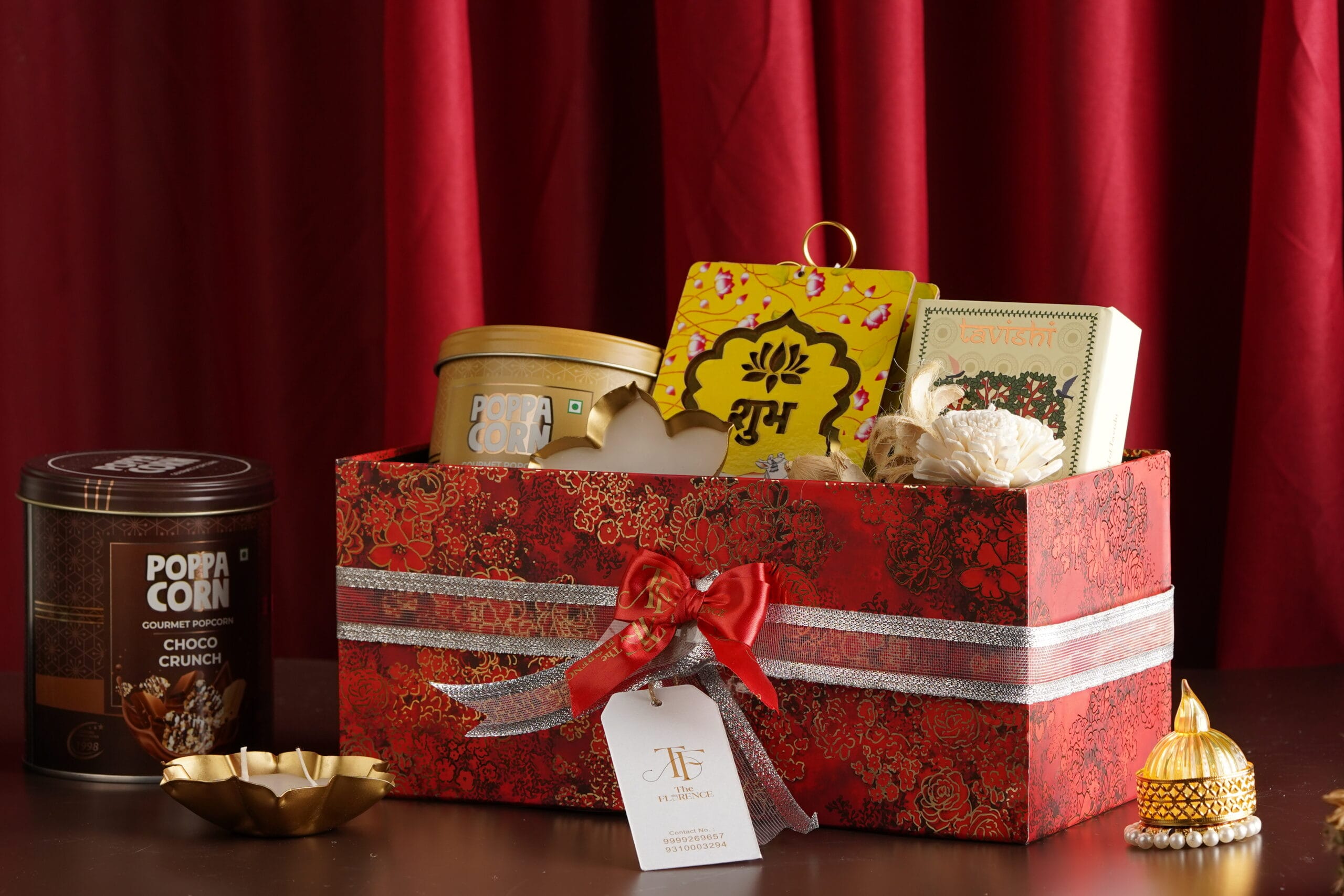 A festive gift box featuring caramel popcorn, a vibrant “Shubh-Labh”