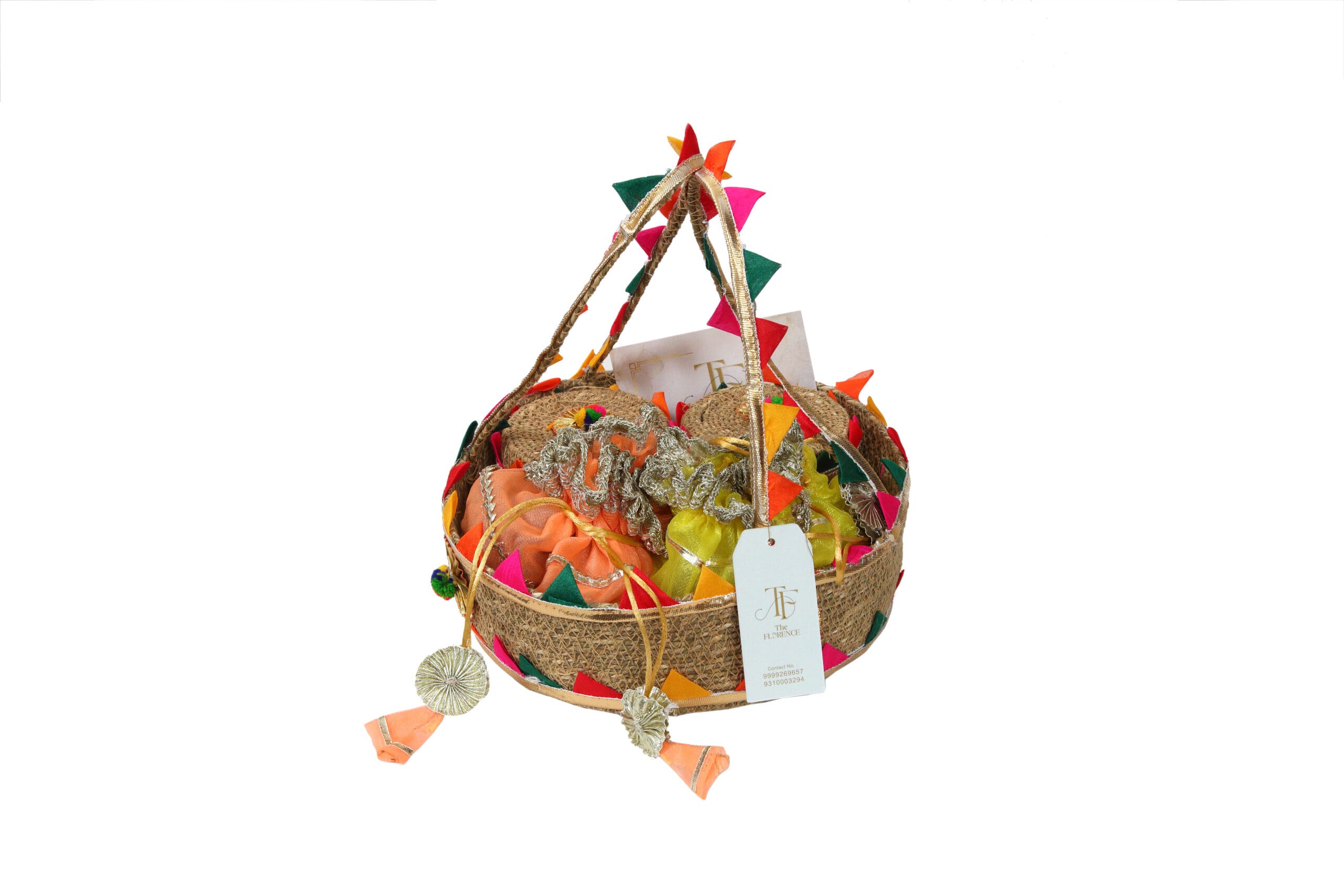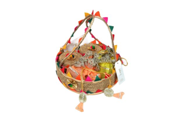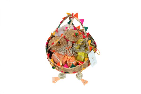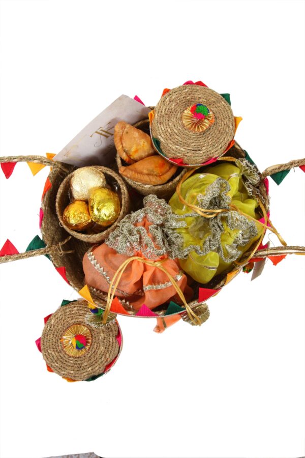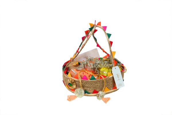 Nestled in a charming jute basket, this exquisitely curated set is designed to delight the senses and elevate any special occasion. It features two elegantly crafted containers, each filled with a delightful assortment of savory and sweet treats, offering a perfect balance of flavors. Adding a touch of sophistication, a luxuriously embellished tissue wrap gracefully encases premium dry fruits, enhancing both presentation and indulgence. Thoughtfully put together, this refined gift set embodies tradition, elegance, and gourmet luxury, making it an ideal choice for festive celebrations, corporate gifting, or expressing heartfelt appreciation in a truly memorable way.